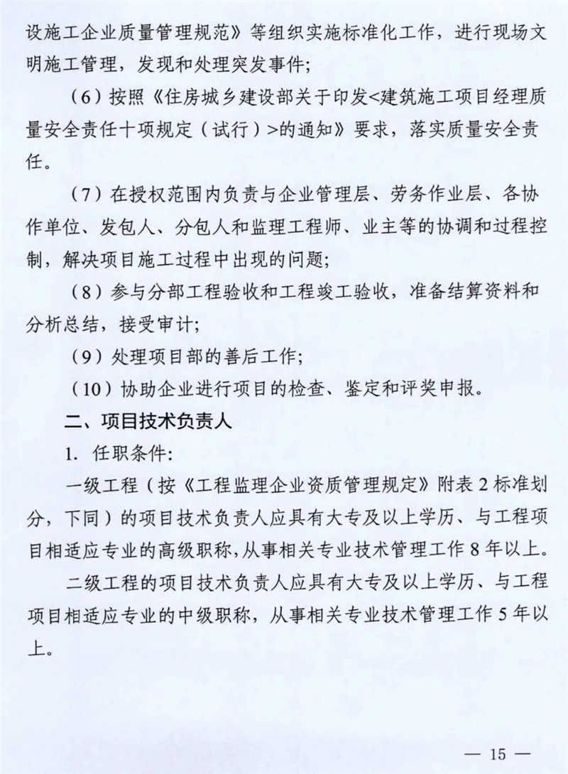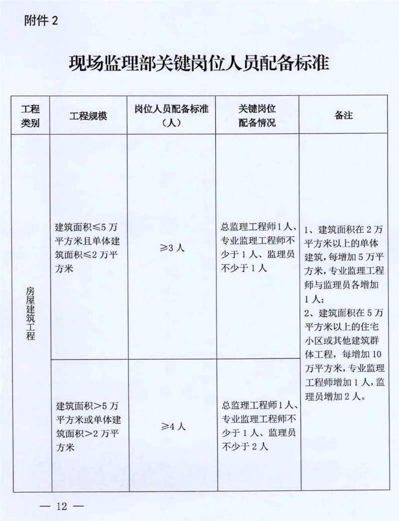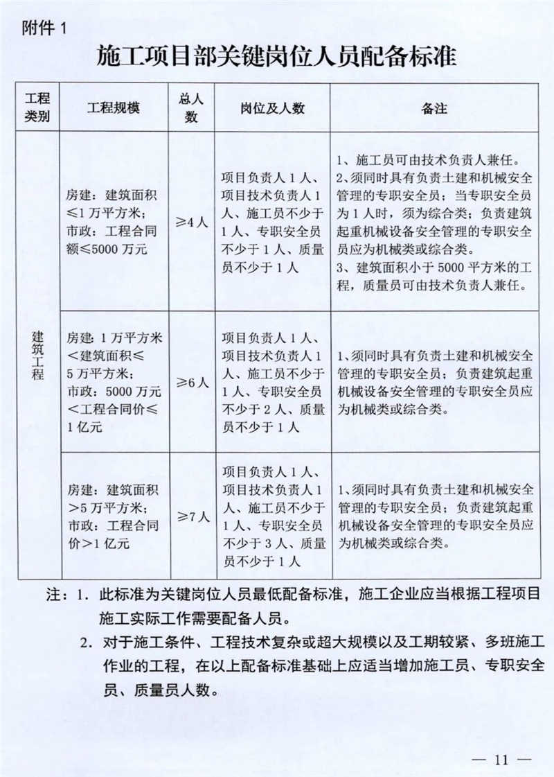 第三條 建筑工程施工項目部、現(xiàn)場監(jiān)理部關(guān)鍵崗位人員數(shù)量不得低于本辦法規(guī)定(施工項目部關(guān)鍵崗位人員配備標準見附件1、現(xiàn)場監(jiān)理部關(guān)鍵崗位人員配備標準見附件2),且必須按規(guī)定認真履行崗位職責(zé)(施工項目部關(guān)鍵崗位人員任職條件和職責(zé)詳見附件3,現(xiàn)場監(jiān)理部關(guān)鍵崗位人員任職條件和職責(zé)詳見附件4)。施工企業(yè)應(yīng)根據(jù)工程需要配備其他相應(yīng)的管理人員。