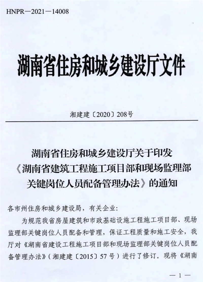 近日,湖南省住建廳發(fā)布《湖南省建筑工程施工項目部和現(xiàn)場監(jiān)理部關(guān)鍵崗位人員配備管理辦法》,自2021年3月15日起實施。