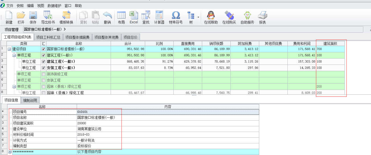 1、啟動智多星項目造價管理軟件,打開已經(jīng)調(diào)整好的工程文件,將下面的項目信息以及后面的建筑面積填寫完整。(單位工程建筑面積一定要填寫!)
