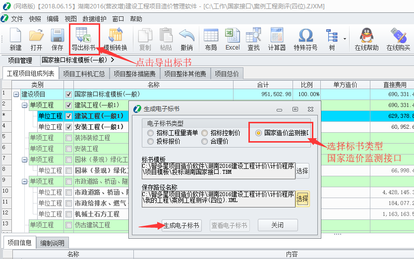 2、隨后找到工具欄的【導出標書】按鈕,彈出的窗口類型選擇國家接口監(jiān)測接口,標書模板路徑無需設(shè)置軟件會自動匹配,最后選擇需要保存的路徑后生成電子標書,默認生成在和工程同一路徑,導出即可。如圖: