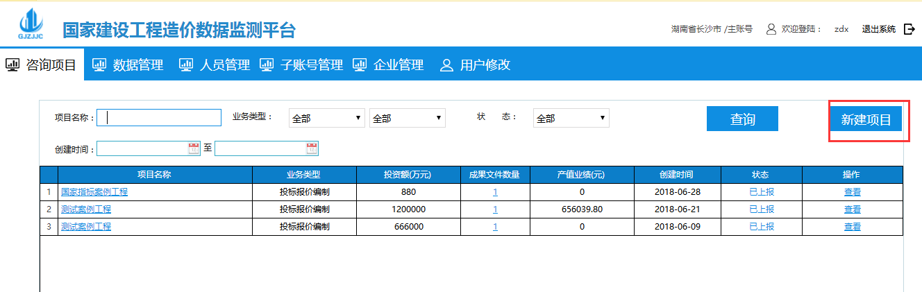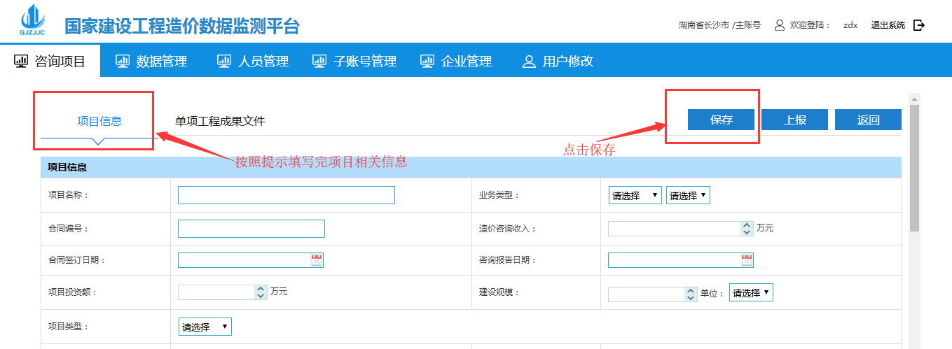 2、進入新建項目后默認在咨詢項目中的項目信息界面,錄入完整的信息然后點擊保存按鈕: