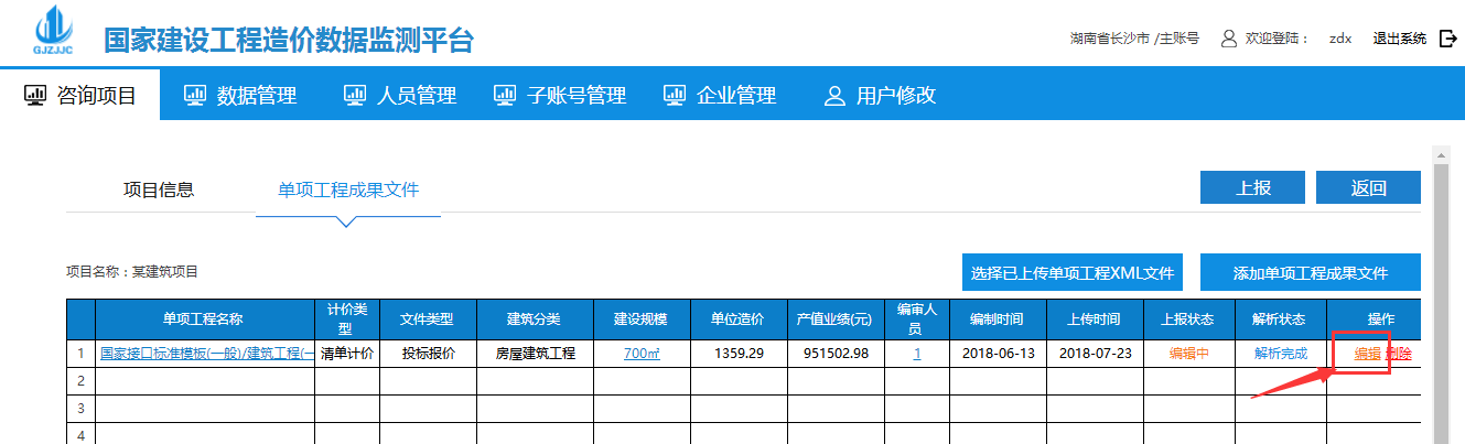4、上傳成功后在單項工程成果文件界面點擊以上傳的文件后面操作欄中的編輯: