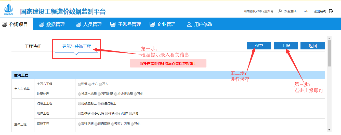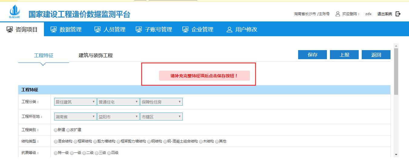 點擊到建筑與裝飾工程界面根據(jù)提示錄入完整特征項后點擊保存按鈕,保存完成后點擊上報即可: