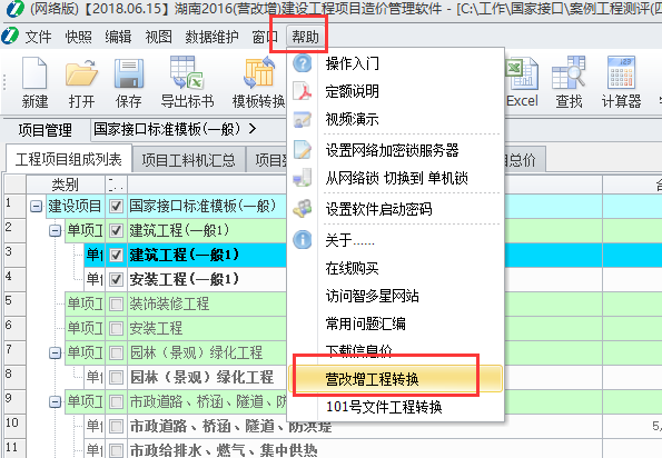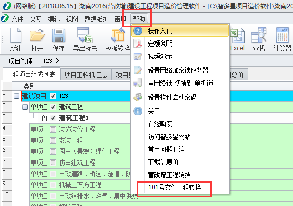 1、首先,打開16版計價軟件后點擊工具欄幫助下的101文件轉(zhuǎn)換。