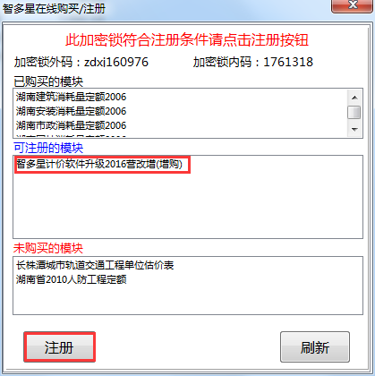 第三步:在彈出的窗口中,系統(tǒng)會自動檢測該加密鎖是否符合自助升級的條件,如符合條件,系統(tǒng)會將可注冊升級的模塊全部羅列展示出來: