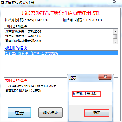 第八步:支付成功之后,回到湖南2016營改增建設(shè)項(xiàng)目造價(jià)管理軟件,在以下界面點(diǎn)擊確定,點(diǎn)擊確定之后將會(huì)提示您注冊成功: