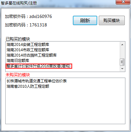 第三步:在軟件主界面,點(diǎn)擊上方“在線購買 ”按鈕(圖1),在未購買模塊中會(huì)出現(xiàn)“湖南計(jì)價(jià)軟件升級2016營改增(增購)”模塊,點(diǎn)擊“購買模塊”按鈕(圖2):